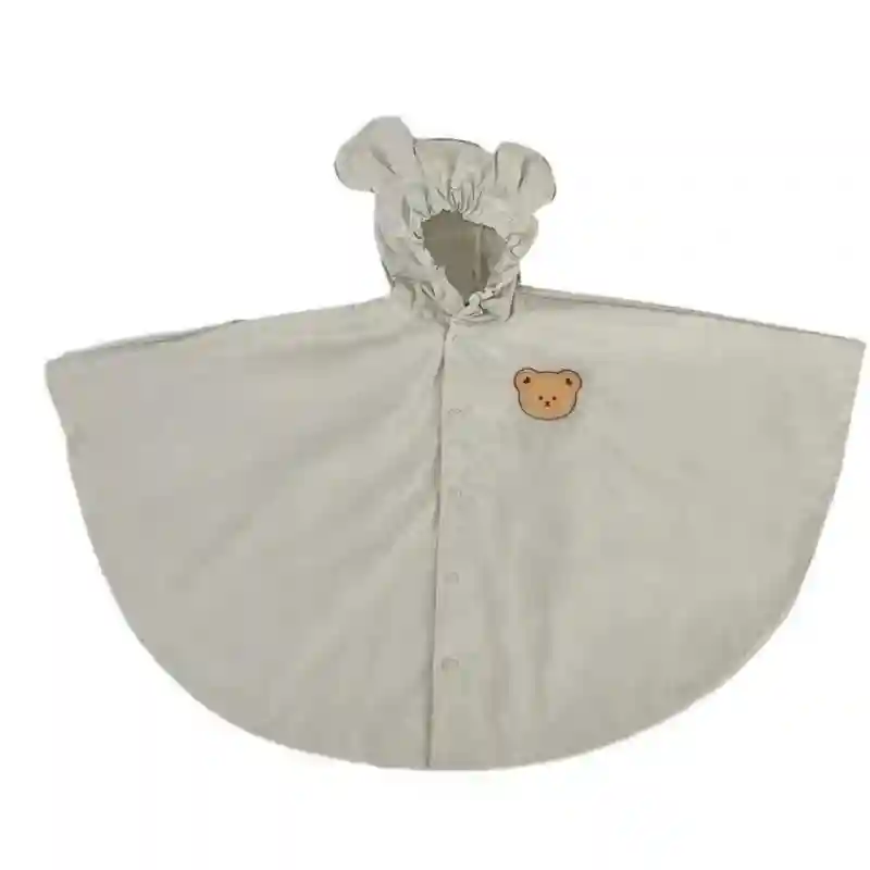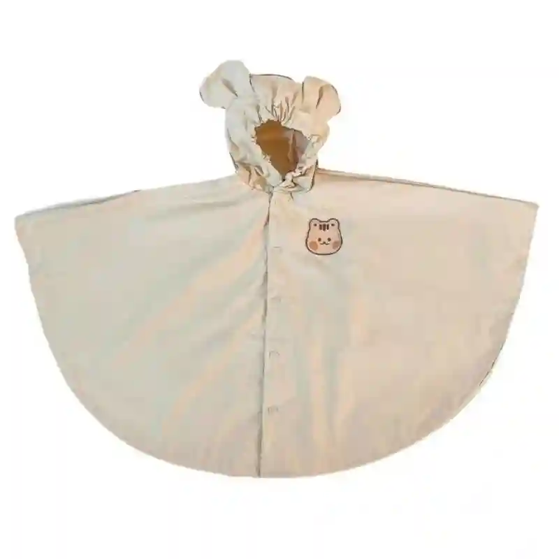 Enfant portant un poncho beige animalier avec oreilles de panda, parfait pour rester au sec tout en explorant sous la pluie.